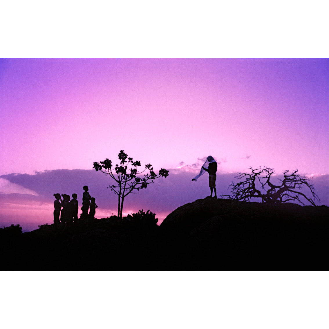 In a series that he chooses to entitle An Ethiopian Tale, Hervé Saint-Hélier retains the narrative form of the “Tale”, predilection of voyagers by dint of achieving an edifying voyage as well as understanding a nation deeply ingrained in oral tradition. Such a manifest detachment from the immediate reality displaces the spectator “elsewhere” in a faraway land. An invitation to perform a change of scenery placed under the sign of an encounter with an ancestral world that requires depriving ourselves from reasoning to awake our potential to be filled with wonder. By some sort of mysterious haze, the photographer renders the atmosphere through silhouettes devoid of depth of field perceived on the top of a hill against the purple twilight conferring a dramatic expression to the picture. Moments of magic extracted from everyday life which we are connected to by the “medium” (the camera and the photographer) that reveals, in one instant, the world of archetypes superseding the real world. The visual plasticity of the pictures draws a symbolic distance between tangible realities experienced by the photographer in their ordinariness versus those very same events as lived emotionally by him with the tragic feeling that they may conceal.